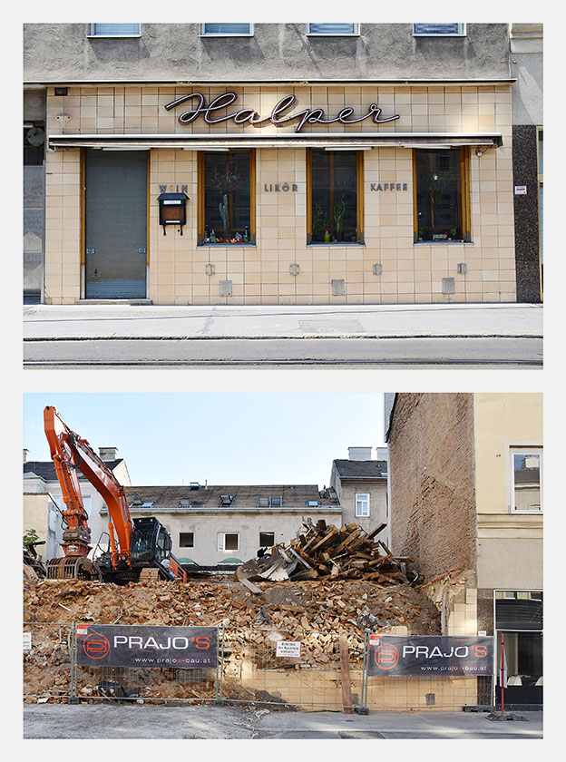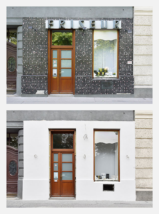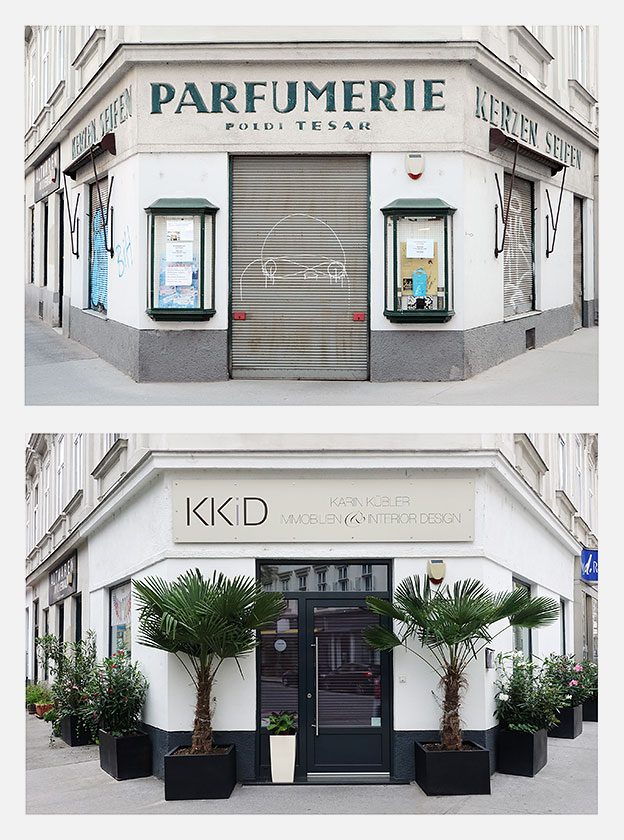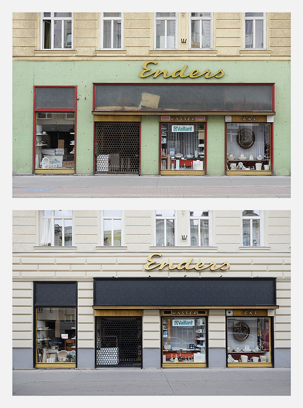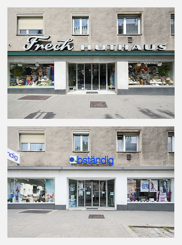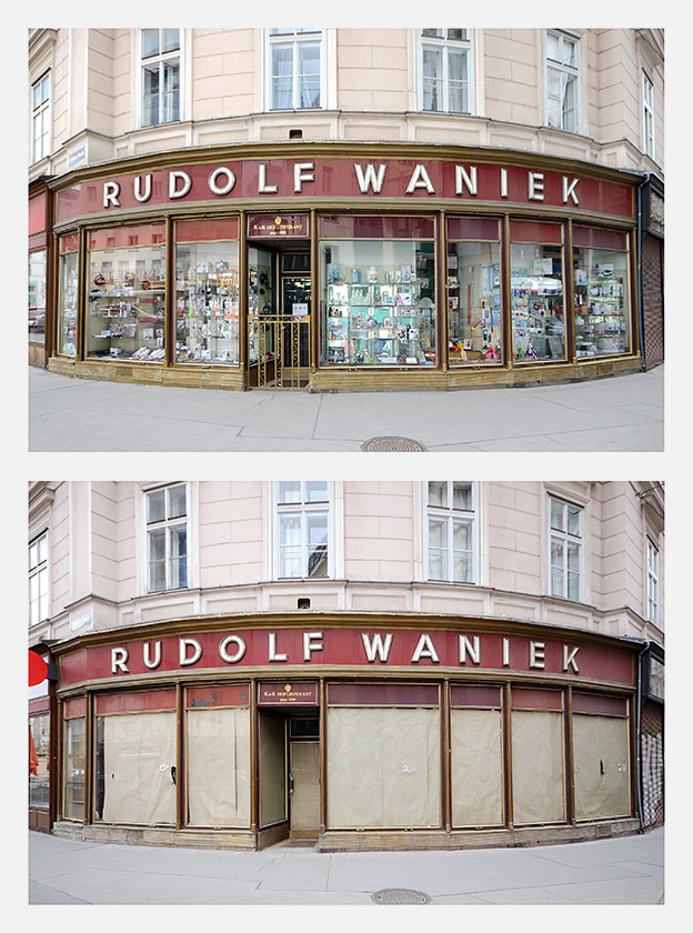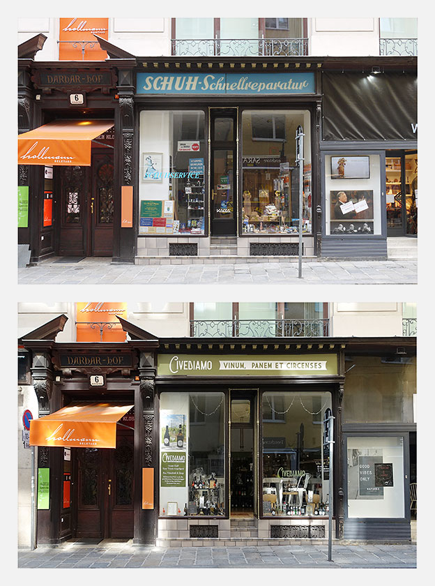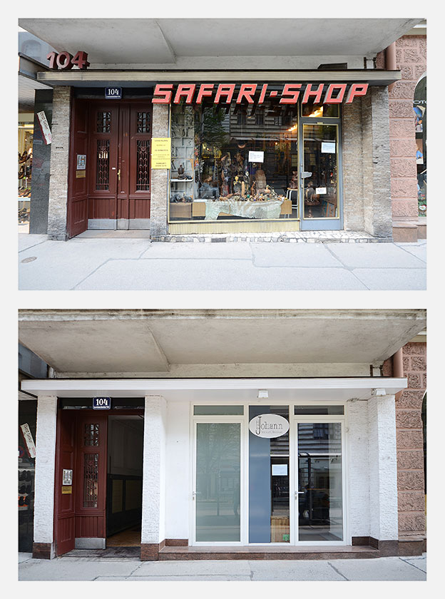 Für die Ausstellung SPURENSUCHE 2018 haben wir erstmals aus unserer Sammlung mehr als 30 Geschäfte ausgewählt, die nicht mehr existieren. Im Sommer 2018 haben wir deren Orte aufgesucht und konnten in vielen Fällen die Veränderungen fotografisch festhalten. Die Aufnahmen der alten Geschäfte wurden den neuen Gegebenheiten gegenübergestellt – 22 dieser Bildpaare waren in der Ausstellung zu sehen und sind in unserem Webshop in streng limitierter Auflage erhältlich: